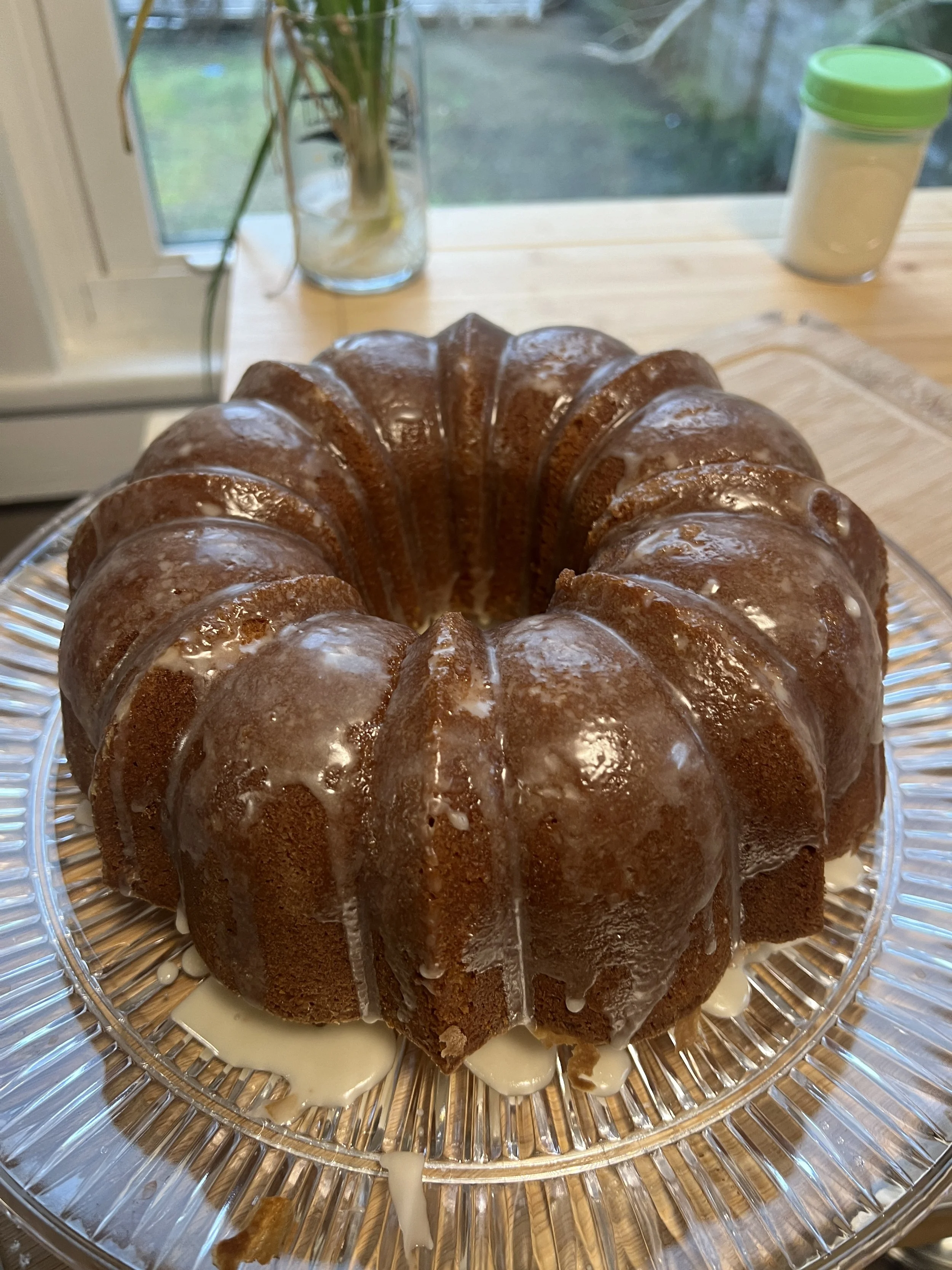 Whisk the powdered sugar and milk together until smooth. Pour the glaze on top of the cake while it’s still warm.